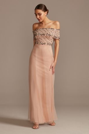 Beaded Bodice Mesh Overlay Off Shoulder Gown David S Bridal