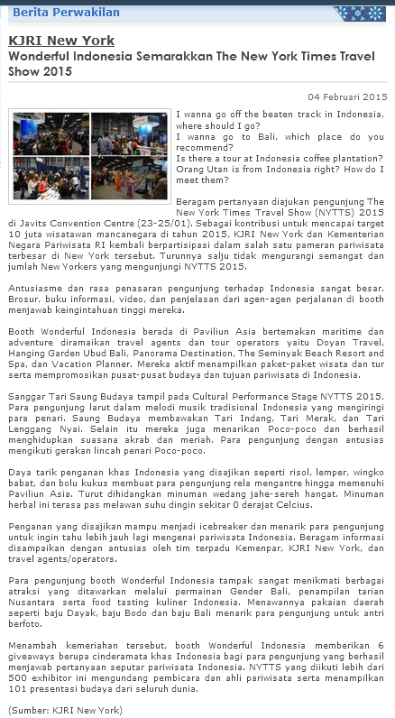 Mofa Indonesia On Twitter Kjri New York Wonderful Indonesia Semarakkan The New York Times Travel Show 2015 Http T Co Enw3euqsqx Http T Co 4s5bxgribs